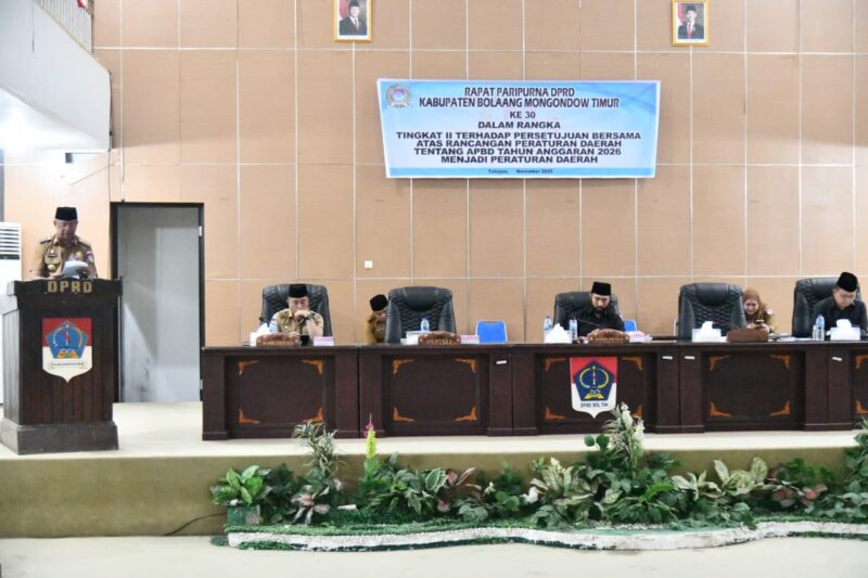 Boltim, Buanatotabuan.co — Bupati Bolaang Mongondow Timur (Boltim), Oskar Manoppo, bersama Wakil Bupati Argo V. Sumaiku, menghadiri Rapat Paripurna Tingkat II untuk menyetujui bersama Rancangan Peraturan Daerah tentang APBD Tahun Anggaran 2026 menjadi Peraturan Daerah. Di ruang rapat Kantor DPRD Boltim, Selasa (11/11).