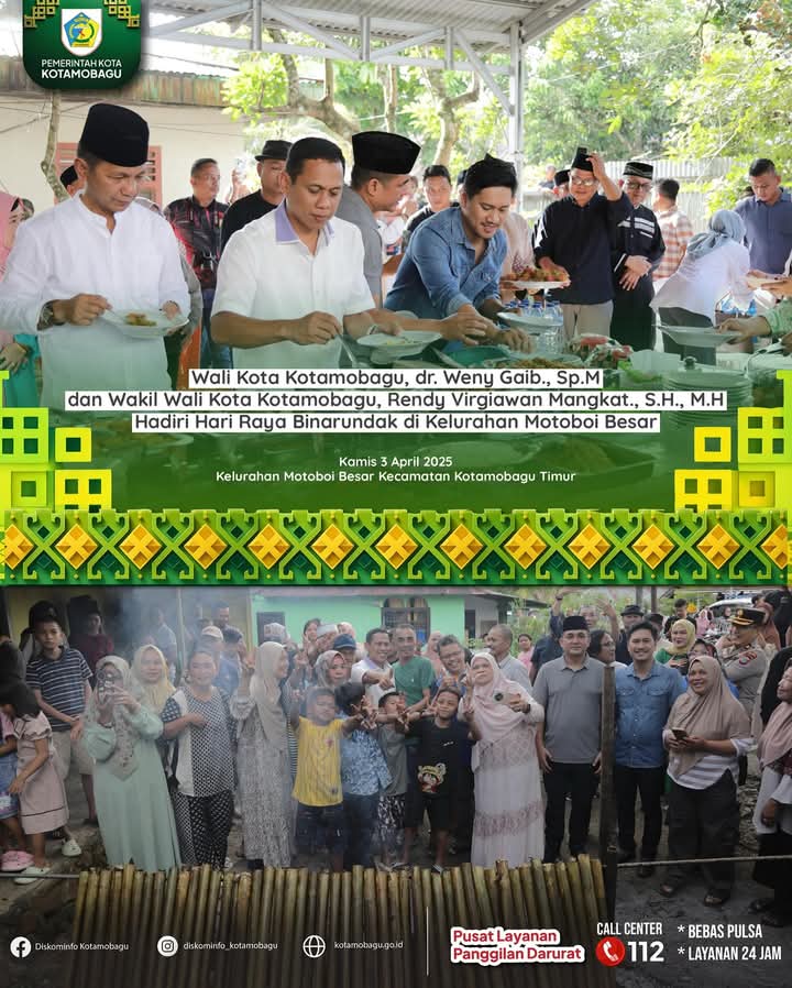 Kotamobagu, BN.co — Wali Kota Kotamobagu, Wenny Gaib, dan Wakil Wali Kota Kotamobagu, Rendy Virgiawan Mangkat, menghadiri perayaan Hari Raya Binarundak yang berlangsung di Kelurahan Motoboi Besar, Kecamatan Kotamobagu Timur, pada Kamis (3/4/2025).